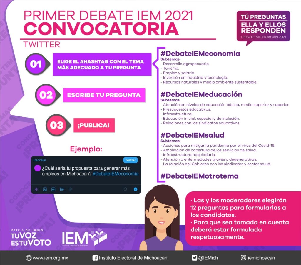 El Instituto Electoral de Michoacán (IEM), lanzó la Convocatoria de Participación Ciudadana para el Primer Debate a la Gubernatura del Estado de Michoacán, en la cual se indican los métodos para elaborar preguntas a través de redes sociales y de las cuales se hará una selección para que sean formuladas a la y los Candidatos el próximo 21 de abril.