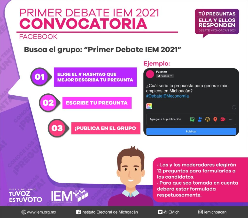 Por otro lado, en Facebook se invita a buscar e ingresar al grupo Primer Debate IEM 2021, donde habrá instrucciones para la formulación de preguntas, las cuales son: elegir el Hashtag del tema que mejor describa la pregunta a realizar, elaborar la pregunta y publicar en el grupo.